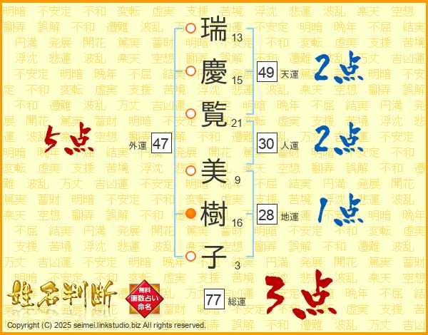 瑞(13画)慶(15画)覧(21画) 美(9画)樹(16画)子(3画)