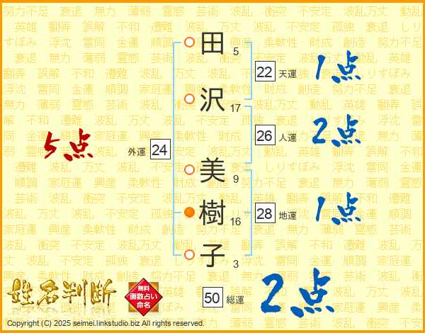 田(5画)沢(17画) 美(9画)樹(16画)子(3画)