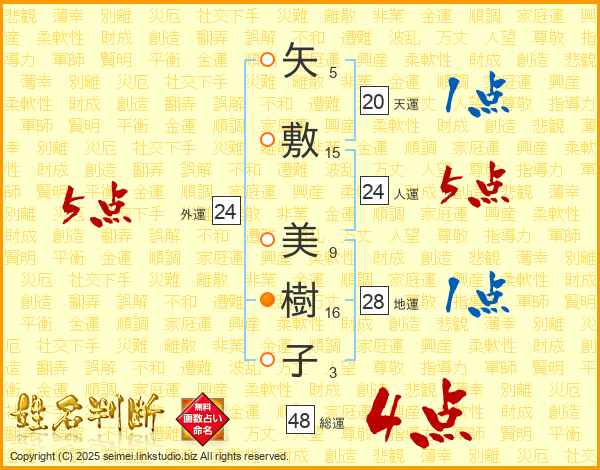 矢(5画)敷(15画) 美(9画)樹(16画)子(3画)