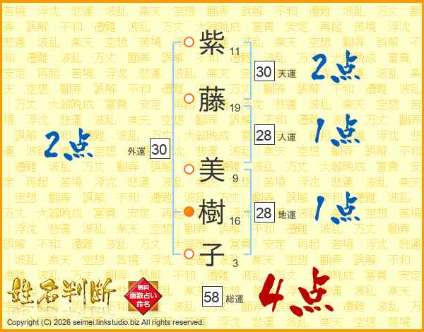 紫(11画)藤(19画) 美(9画)樹(16画)子(3画)