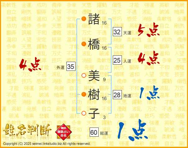 諸(16画)橋(16画) 美(9画)樹(16画)子(3画)