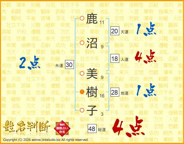 鹿(11画)沼(9画) 美(9画)樹(16画)子(3画)