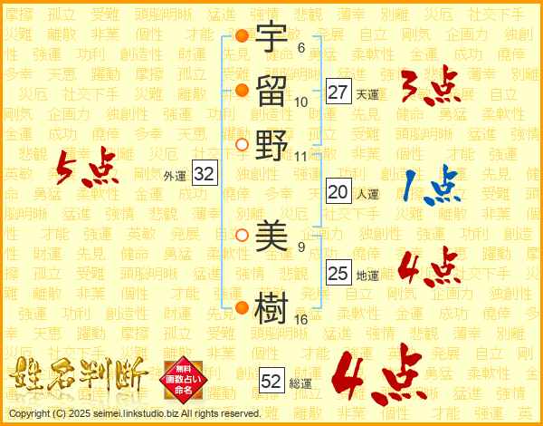 宇留野美樹さんの総運は52画の4点!