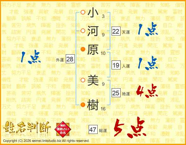 小(3画)河(9画)原(10画) 美(9画)樹(16画)