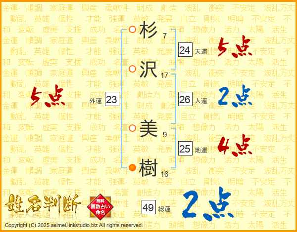 杉(7画)沢(17画) 美(9画)樹(16画)