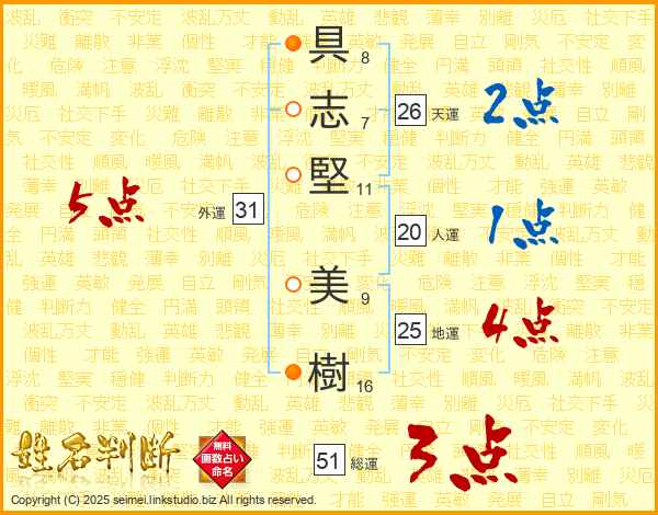 具(8画)志(7画)堅(11画) 美(9画)樹(16画)