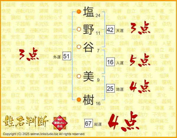 塩(24画)野(11画)谷(7画) 美(9画)樹(16画)