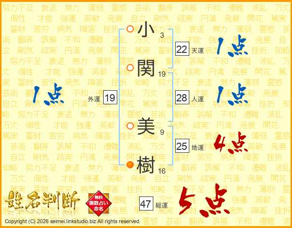 小(3画)関(19画)  美(9画)樹(16画)