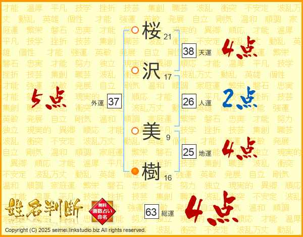 桜(21画)沢(17画)  美(9画)樹(16画)