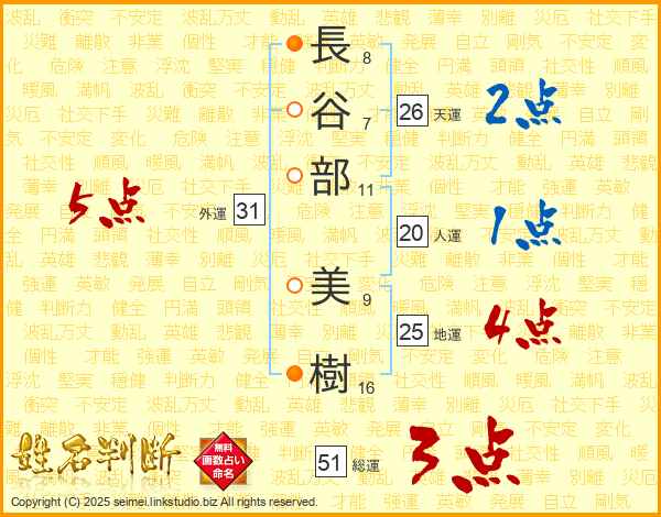 長(8画)谷(7画)部(11画) 美(9画)樹(16画)