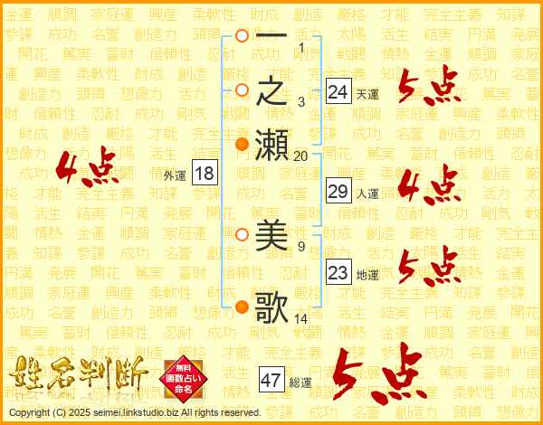 一(1画)之(3画)瀬(20画) 美(9画)歌(14画)