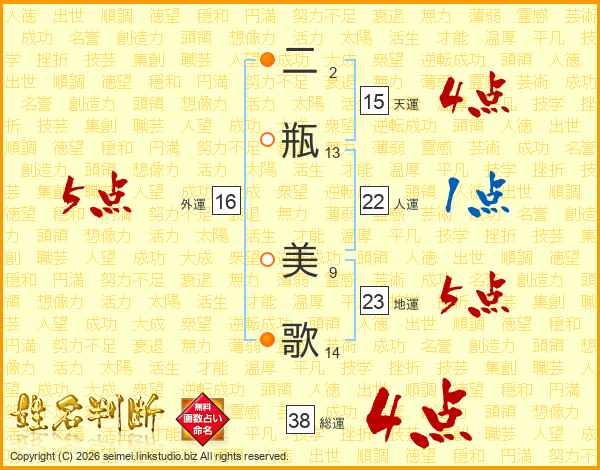 生活面を象徴する運勢です。外部から受ける影響力を表し、結婚運、家庭運や職場、環境への順応性を表します。総運から人運を引いた画数。姓や名が1文字の場合を除く。