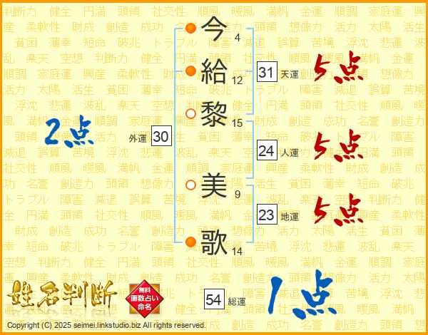 今(4画)給(12画)黎(15画) 美(9画)歌(14画)