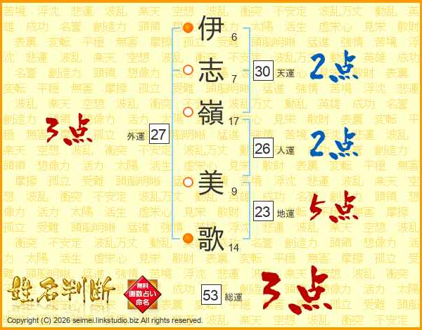 伊(6画)志(7画)嶺(17画) 美(9画)歌(14画)