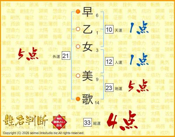 生活面を象徴する運勢です。外部から受ける影響力を表し、結婚運、家庭運や職場、環境への順応性を表します。総運から人運を引いた画数。姓や名が1文字の場合を除く。