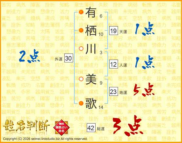 有(6画)栖(10画)川(3画) 美(9画)歌(14画)