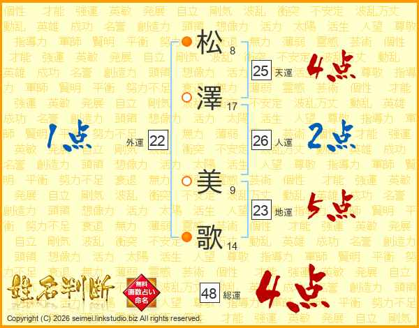 松(8画)澤(17画) 美(9画)歌(14画)
