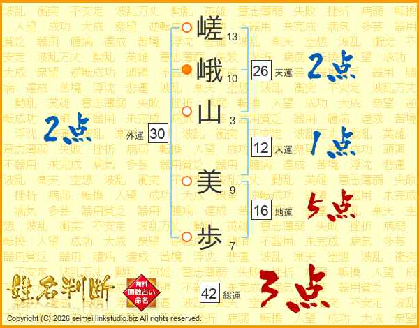 嵯(13画)峨(10画)山(3画) 美(9画)歩(7画)