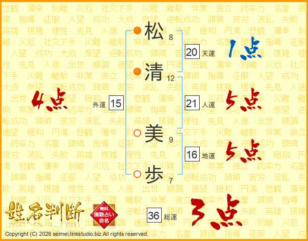 生活面を象徴する運勢です。外部から受ける影響力を表し、結婚運、家庭運や職場、環境への順応性を表します。総運から人運を引いた画数。姓や名が1文字の場合を除く。