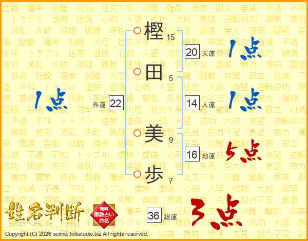 樫(15画)田(5画) 美(9画)歩(7画)