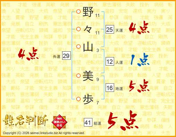 野(11画)々(11画)山(3画) 美(9画)歩(7画)
