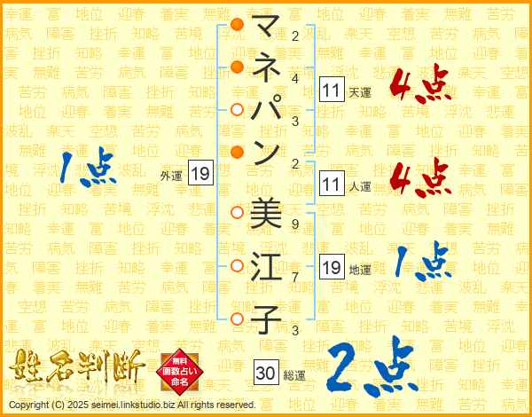 マ(2画)ネ(4画)パ(3画)ン(2画)  美(9画)江(7画)子(3画)