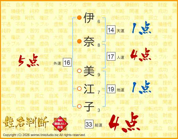 伊(6画)奈(8画) 美(9画)江(7画)子(3画)
