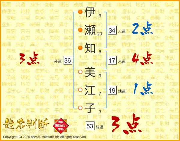 伊(6画)瀬(20画)知(8画) 美(9画)江(7画)子(3画)