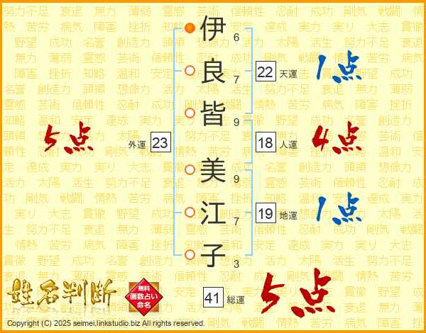 伊(6画)良(7画)皆(9画) 美(9画)江(7画)子(3画)