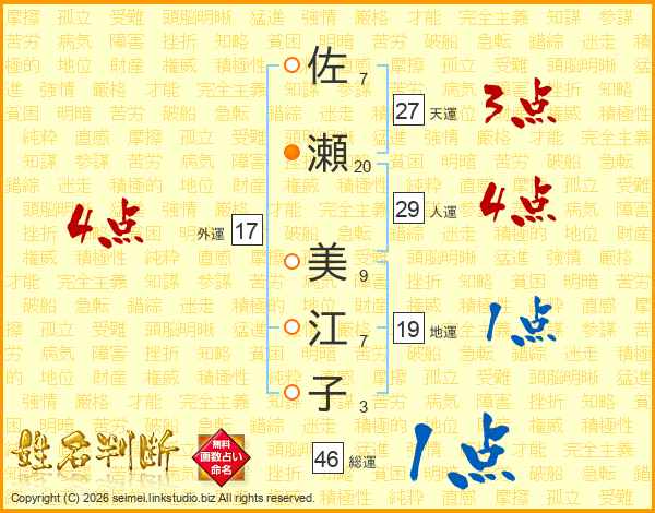 佐(7画)瀬(20画) 美(9画)江(7画)子(3画)
