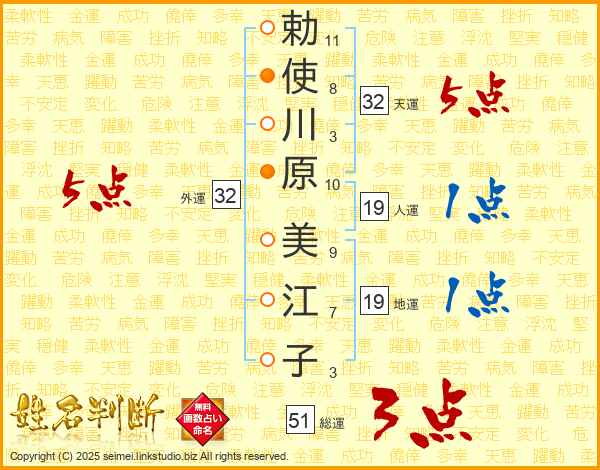 勅(11画)使(8画)川(3画)原(10画) 美(9画)江(7画)子(3画)