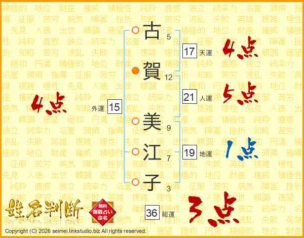 古(5画)賀(12画) 美(9画)江(7画)子(3画)
