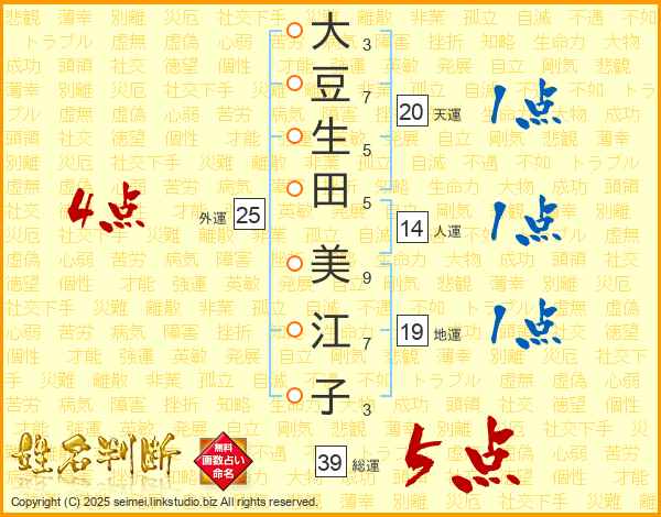 大豆生田美江子さんの総運は39画の5点!