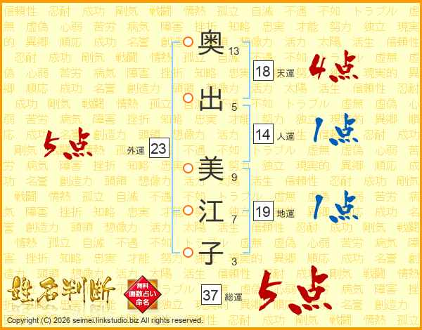 奥(13画)出(5画) 美(9画)江(7画)子(3画)