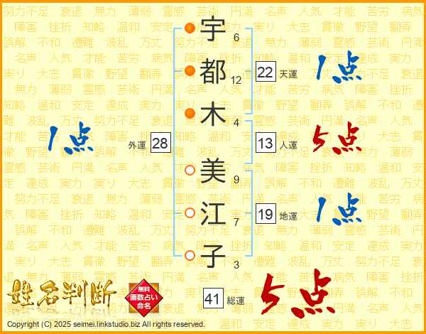 宇(6画)都(12画)木(4画) 美(9画)江(7画)子(3画)