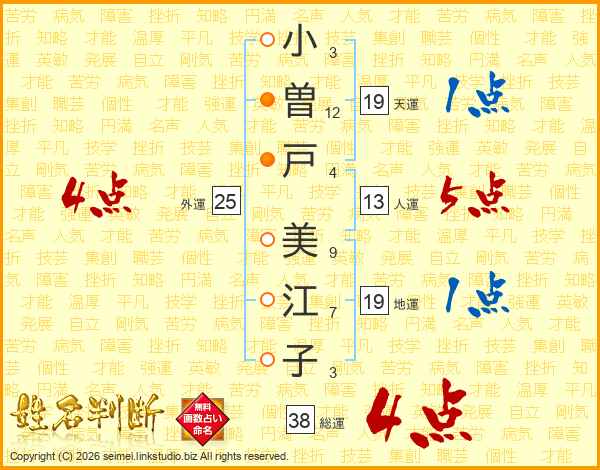 小(3画)曽(12画)戸(4画) 美(9画)江(7画)子(3画)