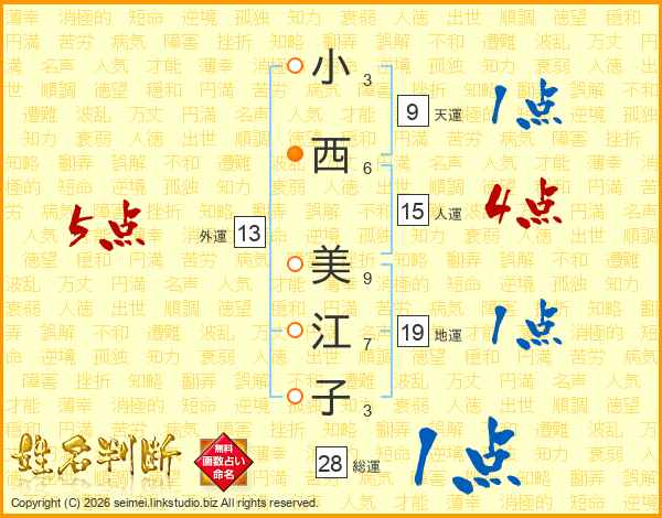 小(3画)西(6画) 美(9画)江(7画)子(3画)