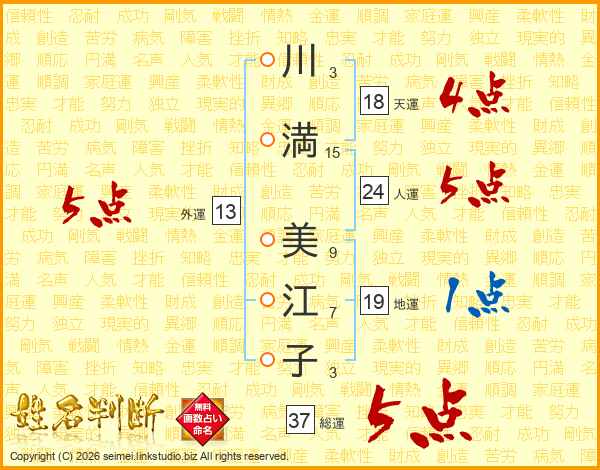 川(3画)満(15画) 美(9画)江(7画)子(3画)