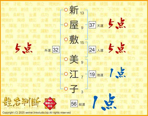 新(13画)屋(9画)敷(15画) 美(9画)江(7画)子(3画)