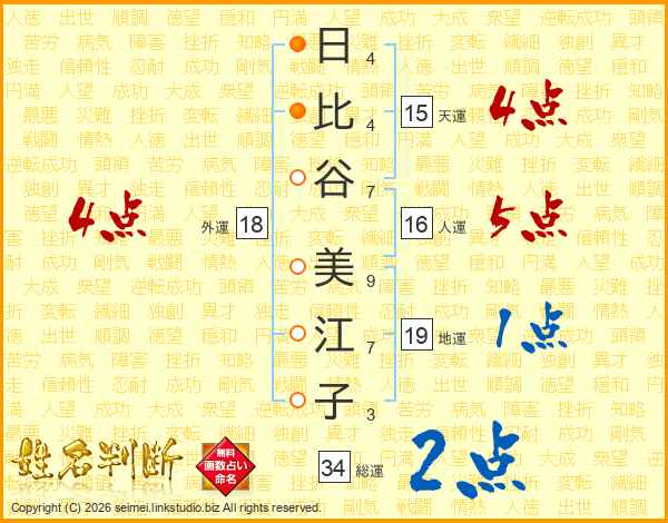 日(4画)比(4画)谷(7画) 美(9画)江(7画)子(3画)