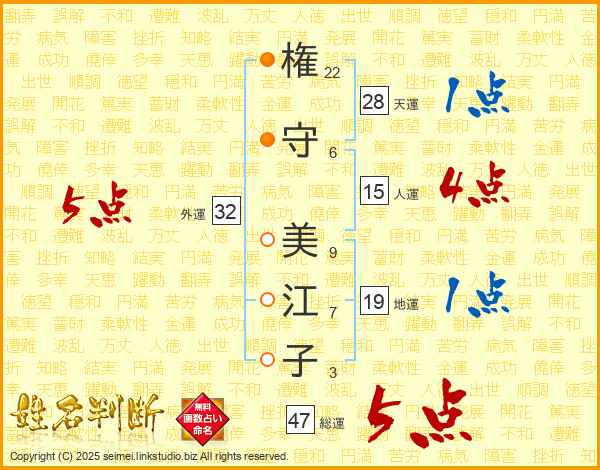 権(22画)守(6画) 美(9画)江(7画)子(3画)