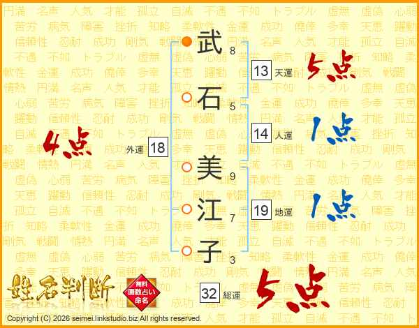 武(8画)石(5画) 美(9画)江(7画)子(3画)