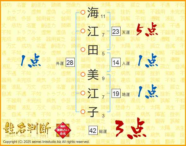海(11画)江(7画)田(5画) 美(9画)江(7画)子(3画)