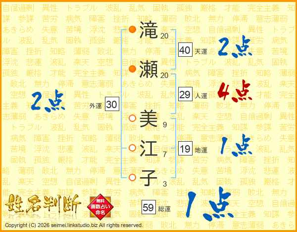 滝(20画)瀬(20画) 美(9画)江(7画)子(3画)