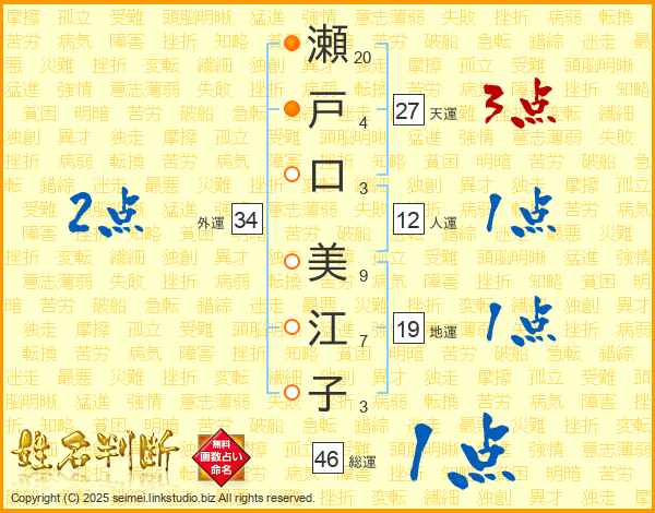 瀬(20画)戸(4画)口(3画) 美(9画)江(7画)子(3画)