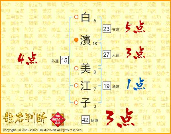 白(5画)濱(18画) 美(9画)江(7画)子(3画)
