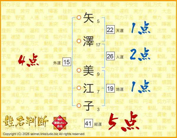 矢(5画)澤(17画) 美(9画)江(7画)子(3画)