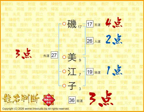 磯(17画) 美(9画)江(7画)子(3画)