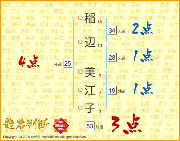 稲(15画)辺(19画) 美(9画)江(7画)子(3画)