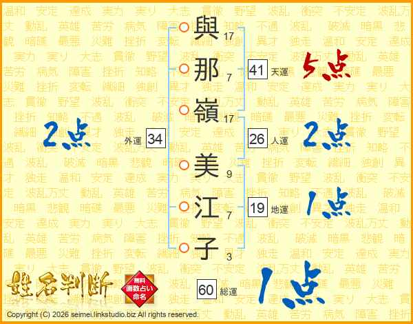 與(17画)那(7画)嶺(17画) 美(9画)江(7画)子(3画)